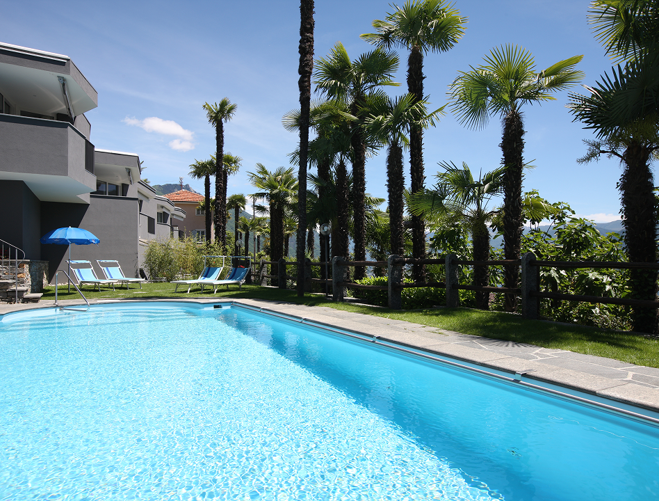 Der Garten des Hotel Stella ist mit Palmen und Blumen angelegt und bietet verschiedene Bereiche für unterschiedliche Bedürfnisse. Liegewiese und Sonnenterrasse laden zum Entspannen ein, schattige Plätze bieten Rückzug an heissen Tagen. Der beheizte Aussenpool ist in dieser Preisklasse und Region selten und bietet direkten Blick auf den See. Während Familien den Spielplatz und die Rasenfläche schätzen, finden Paare ruhige Ecken zum Lesen.
